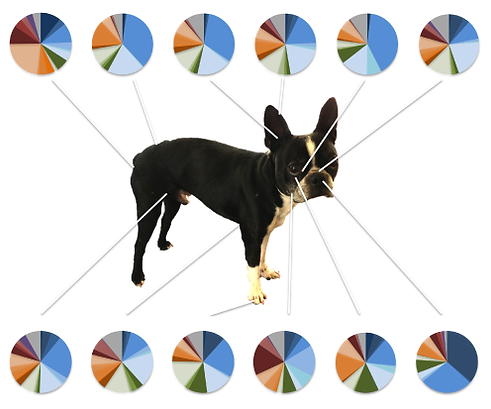 Figure 1: Each circle represents the total bacterial composition in different sites on the skin of healthy dogs. Every color represents a different bacterium. (Figure adapted from [3])