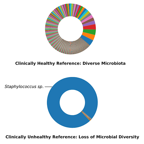 When we sequence the DNA of all the bacteria and fungi that are present in a patient’s sample, we can directly identify potential pathogens, assess the microbial diversity, and compare the patient’s sample with those of healthy dogs as controls. An example is shown in figure 2 (to the right) where there is a striking difference between the healthy sample on the top, and the diseased skin sample on the bottom.