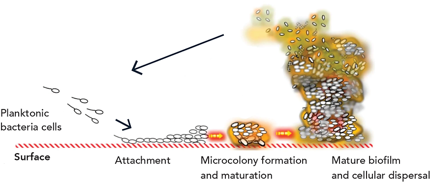 Biofilms are living, three-dimensional structures formed by a multispecies consortia of microorganisms which are encased in a self-secreted extracellular matrix. This matrix consists of polysaccharides, proteins, and DNA. Within biofilms, bacteria can further protect themselves from disturbances in their environment and microorganisms within biofilms are generally less susceptible to antibiotics.