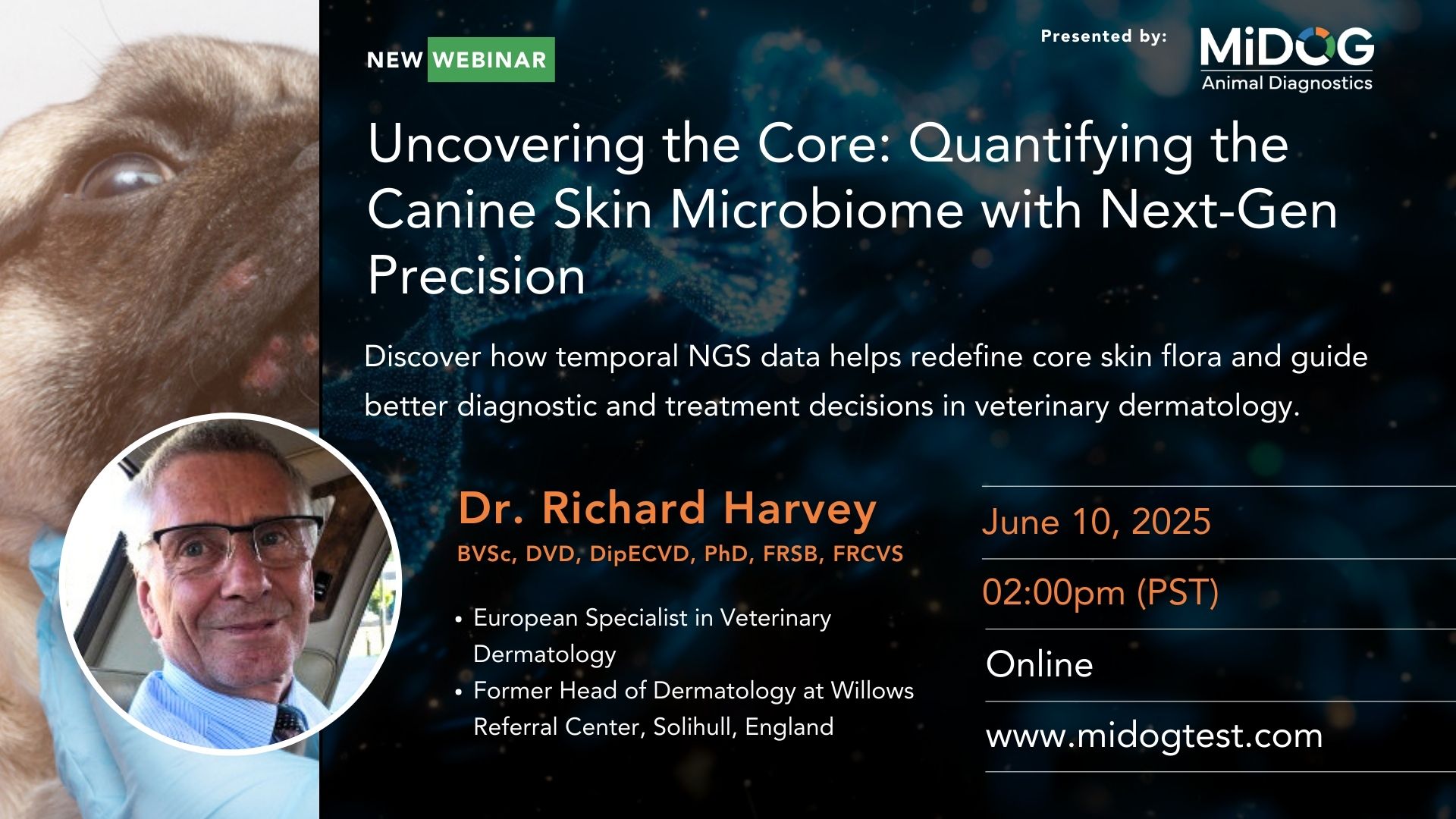 In this exclusive webinar, renowned veterinary dermatologist Dr. Richard Harvey joins the MiDOG scientific team to discuss groundbreaking research into the core skin microbiome of healthy dogs. Backed by real temporal and quantitative NGS data, this session will explore: